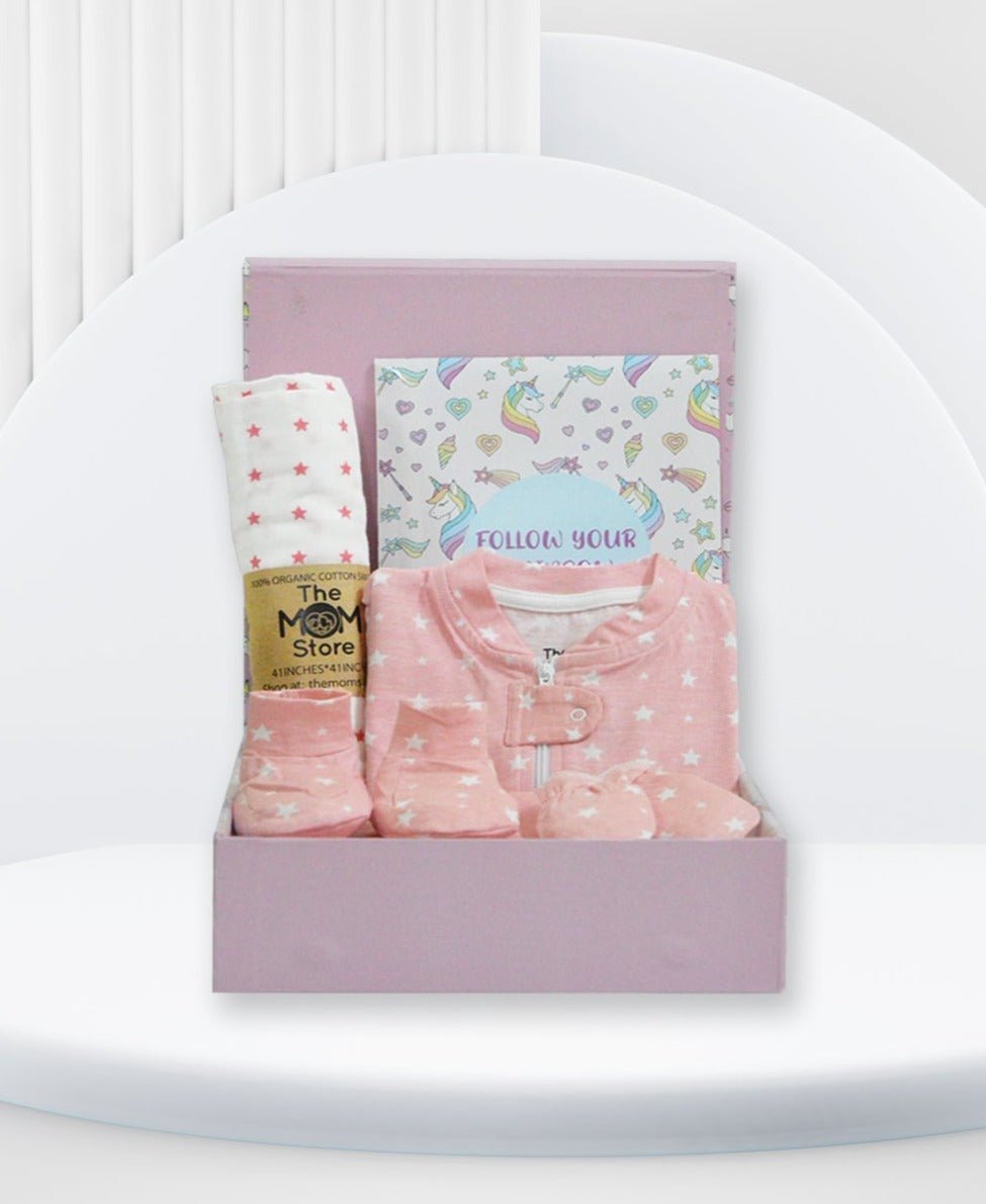 The Mom store presents multi pieces gift set for babies - Glitter. Set contains one Romper, one matching set of Cap + Mitten + Bootie, one Swaddle and one set of Milestone Cards and . The prints on this set is attractive and beautiful. Made from cotton, this combo set ensures optimum comfort. This soft 6 piece set will be a perfect addition to your little ones collection.