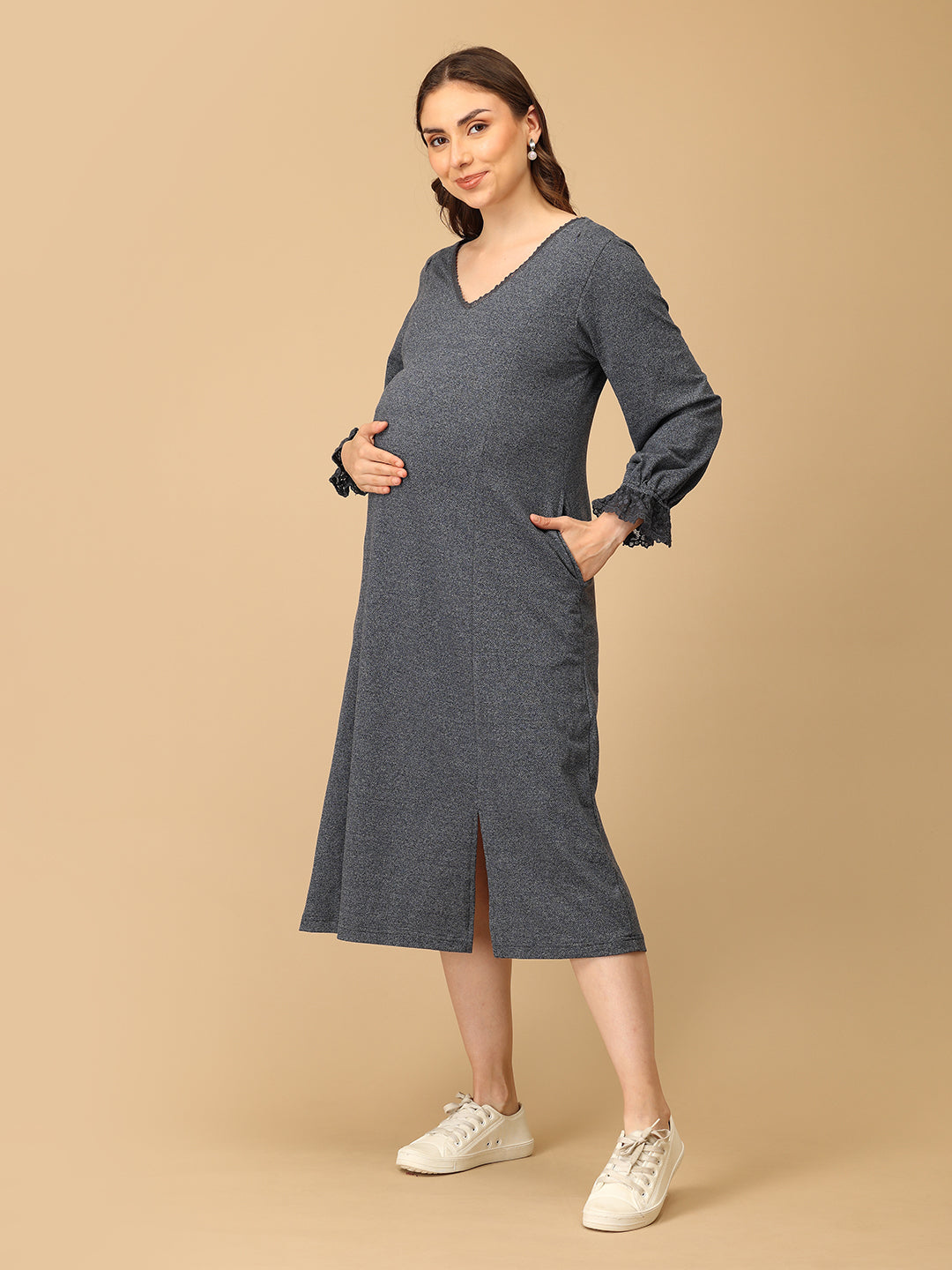 - Grey Fleece Sweater Dress Cotton Lace Detailing