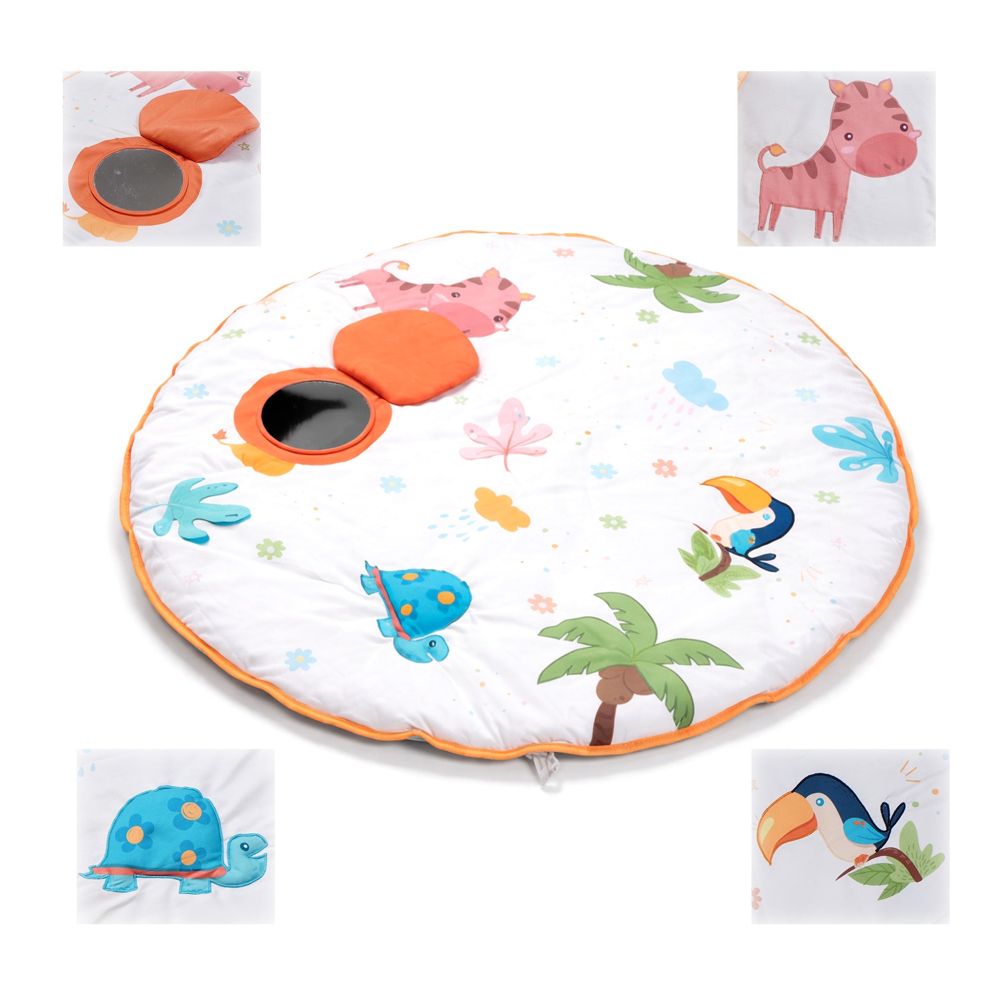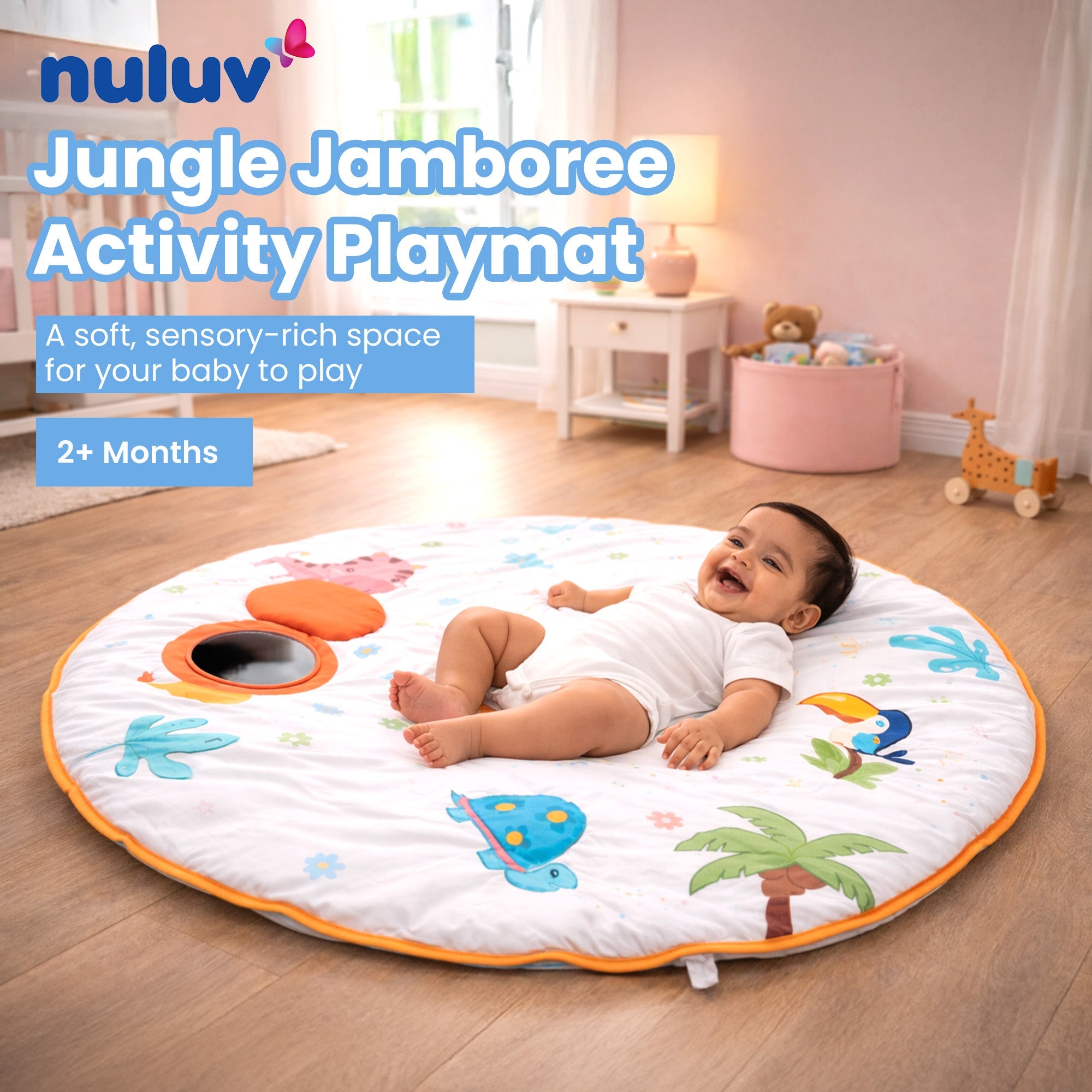 Turn everyday playtime into a world of discovery with the Nuluv Jungle Jamboree Playmat. Designed for babies 2+ months, this enchanting playmat is packed with developmental benefits, from boosting motor skills and sensory awareness to promoting tummy time support and social-emotional growth.Equipped with hanging toys, crinkles, squeakers, rattles, and hanging leaves, it keeps your little one curious and entertained. The convertible design allows it to transform into a soft playmat by simply removing the arches, while its foldable structure makes it perfect for travel and compact storage.Made with premium breathable, non-toxic materials, this playgym ensures your baby’s comfort and safety. Parents will love the easy assembly, quick cleaning, and detachable poles for hassle-free use. With BIS-certified safety and durable design, Nuluv brings you a trusted playtime essential that nurtures growth, learning, and happiness.