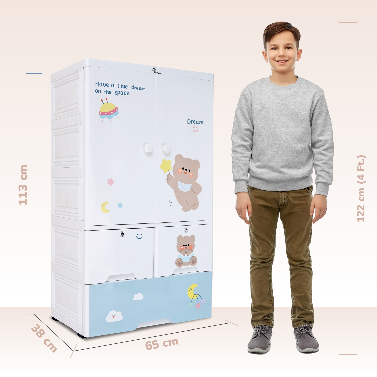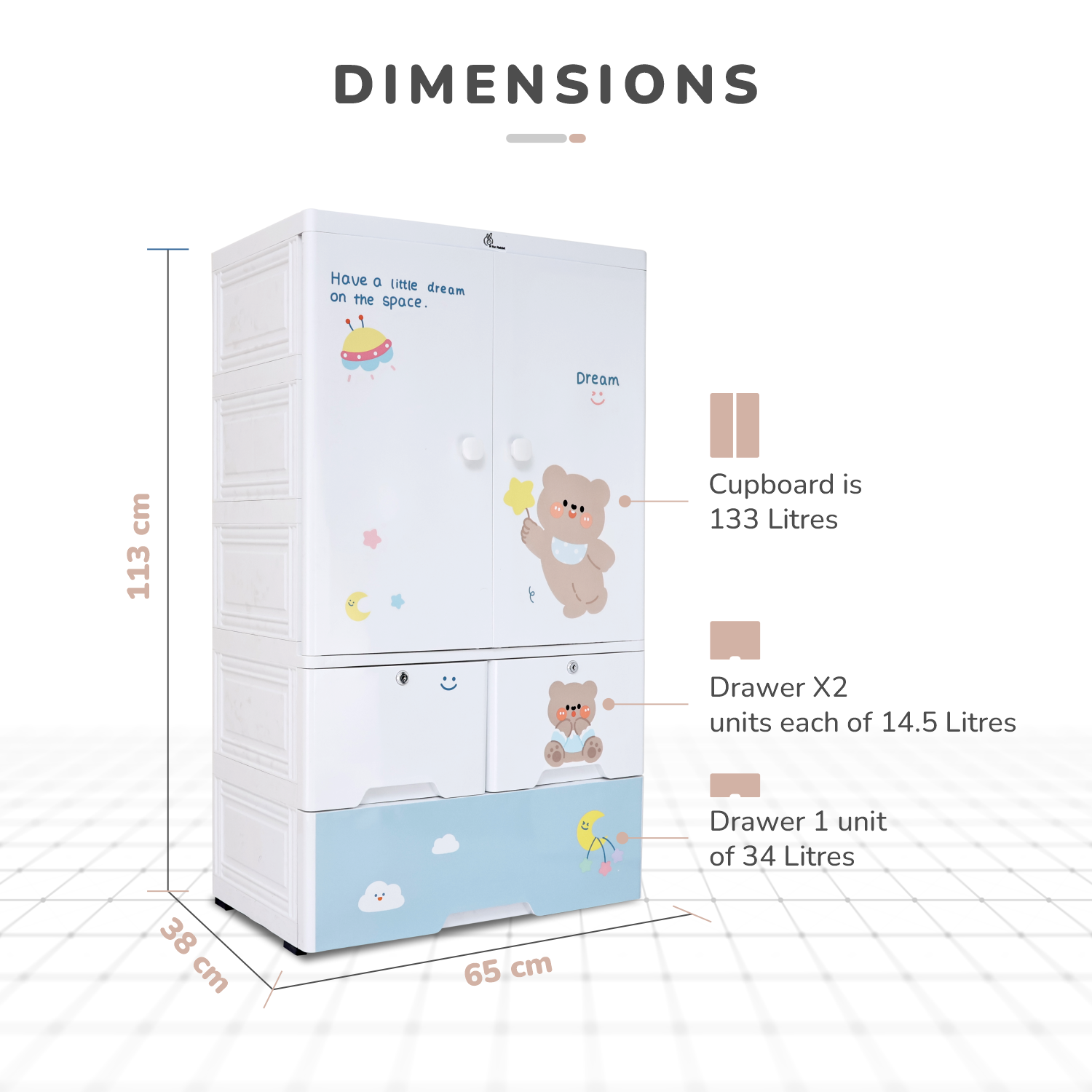 Capacity: Small drawer X2 units each of 14.5Litres, Big Drawer 1 unit of 34 Litres, Capacity of Cupboard is 133 Litres