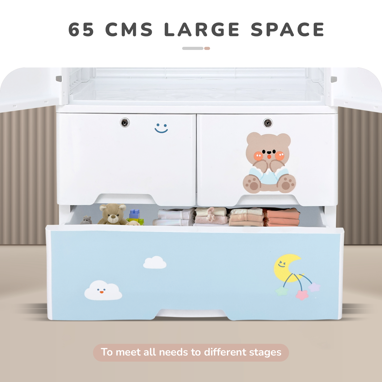 Worried about the clutter in your kids’ hangout space? Well, R for Rabbit’s Kiddo Korner Stellar, a storage organizer for kids, is here to transform your chaos into order with its easy plug-and-play model. This cupboard is made from non-toxic PP material and provides a roomy space with three spacious drawers. This is to store all the kids’ essentials, from nappies and toys to clothes, and also their top-secret collections. It has rustproof stainless steel rods for hanging adorable clothes, hats, superhero capes, and more. The cupboard doors are kept secure by locking doors to keep the inner storage intact. Also, if you are worried about stability, then this cupboard comes with an anti-skid base that promotes scratch-free and non-squeaky movement. It also comes in an adorable design with round edges ensuring your little one’s safety. R for Rabbit’s Kiddo Korner Stellar is beyond storage; it is peace of mind, style, and sanity, all rolled into one!