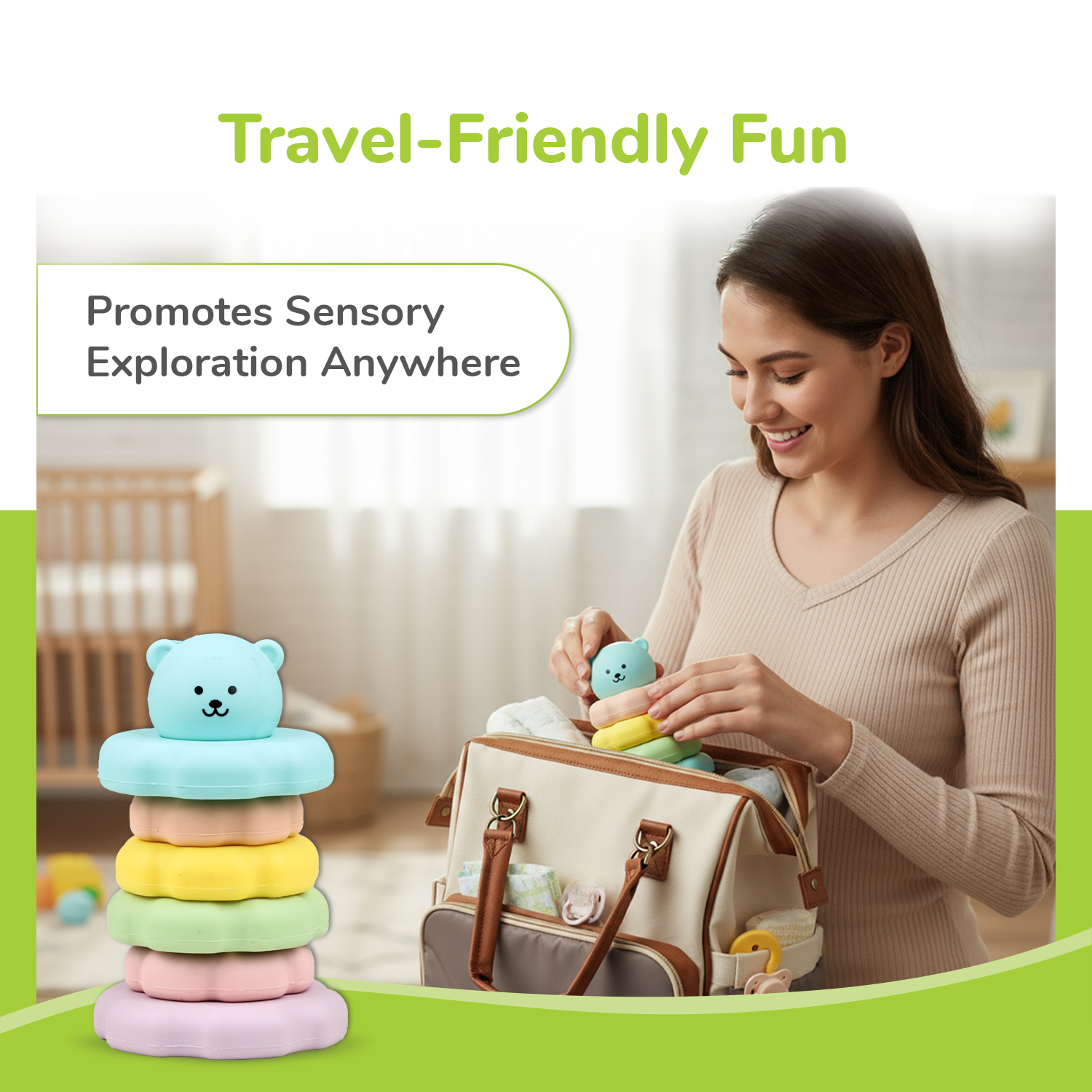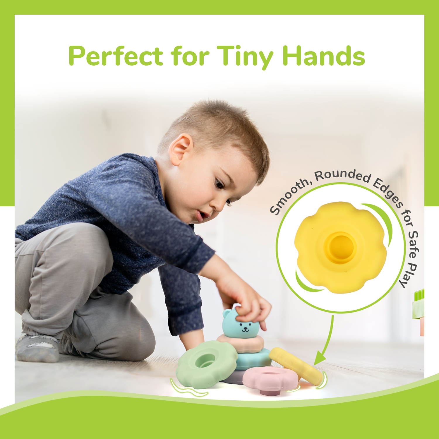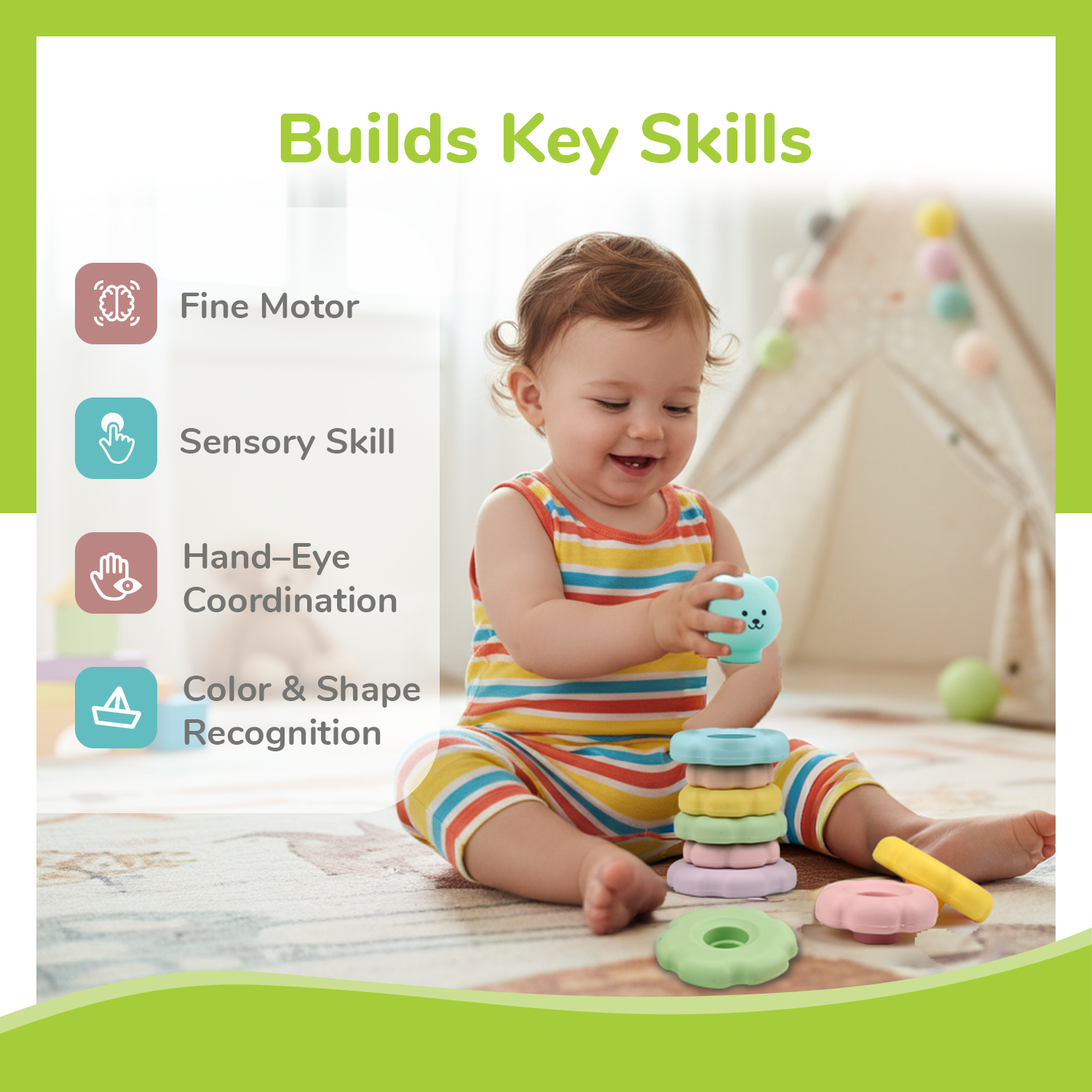 Essential Skill Development: This toy is a developmental powerhouse, as it provides hand-eye coordination through the placement of rings, offers sensory stimulation through various texture, shape, and size exploration, and helps them recognize different colors and shapes.