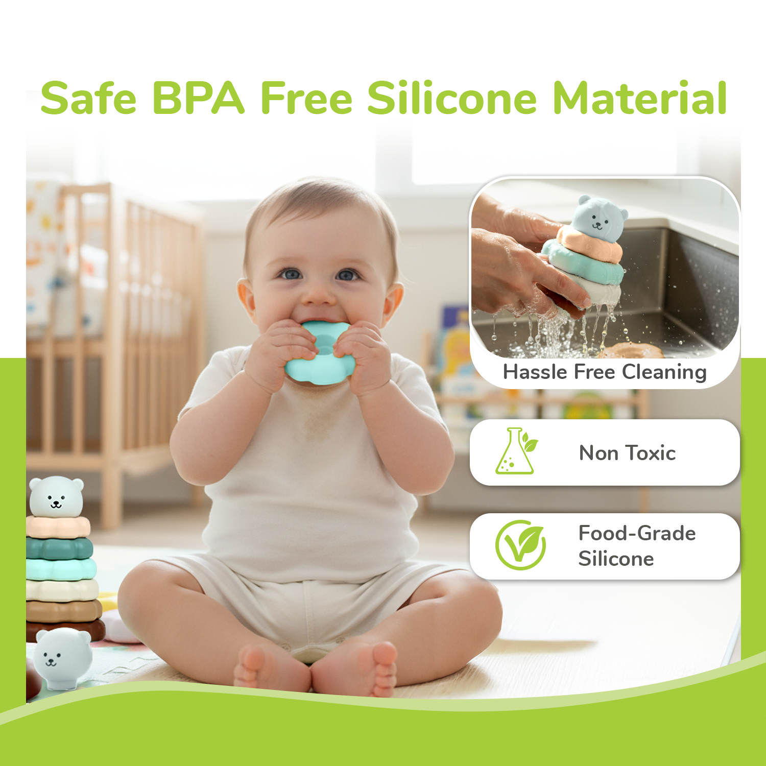Easy Maintenance: R for Rabbit’s Orapple Teddy stacker is designed with a smooth, easy-to-clean surface that could be wiped down in seconds. This contributes to a healthier play habit and fewer germs, promoting a hygienic play environment.
