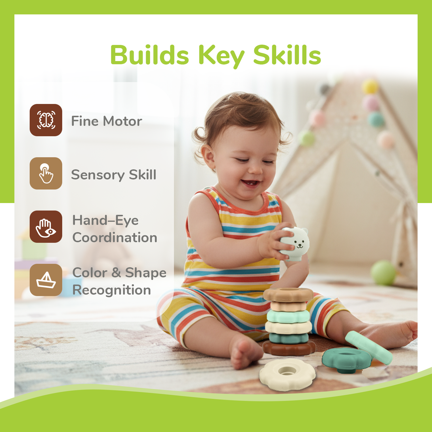Essential Skill Development: This toy is a developmental powerhouse, as it provides hand-eye coordination through the placement of rings, offers sensory stimulation through various texture, shape, and size exploration, and helps them recognize different colors and shapes.