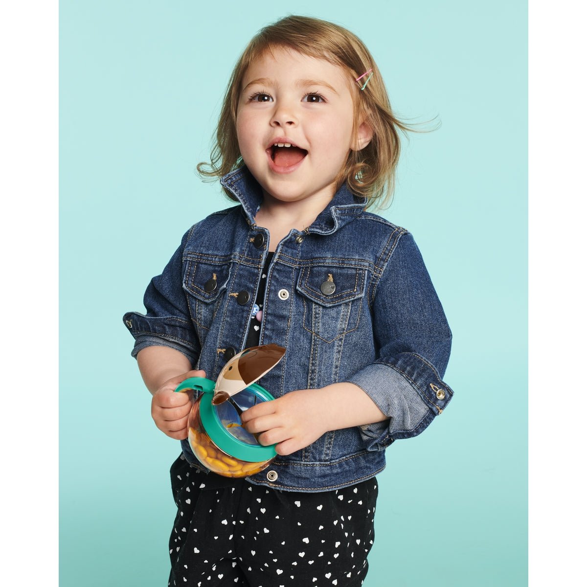 Perfect for toting munchies, this cute cup encourages independent snacking without the mess. The easy-grip handle is sized just right for little hands, and the snap top lid ensures food stays fresh. The flexible inside opening keeps snacks from spilling out - even if its tipped over. With two lids there's less mess and moms bag stays crumb-free!