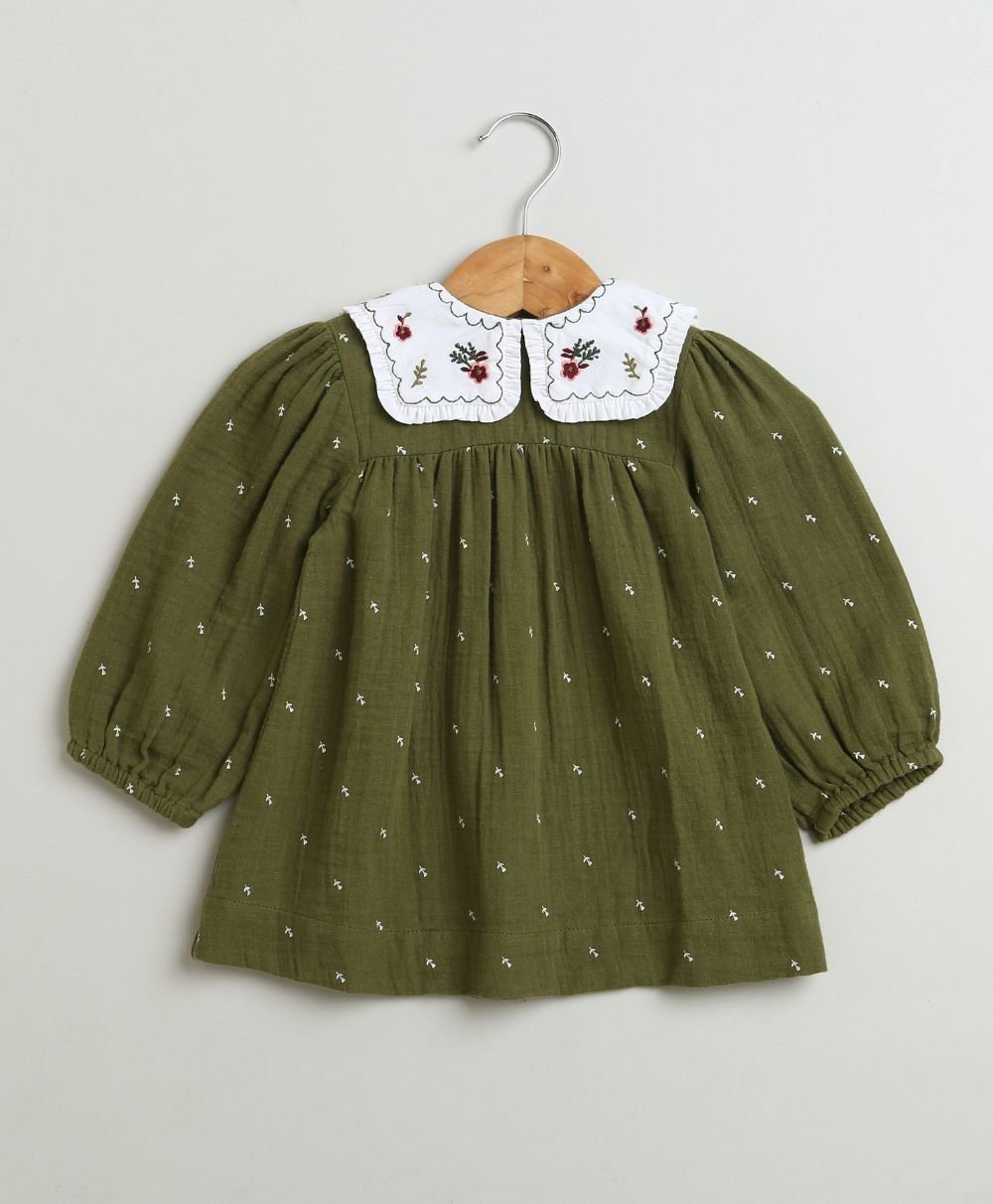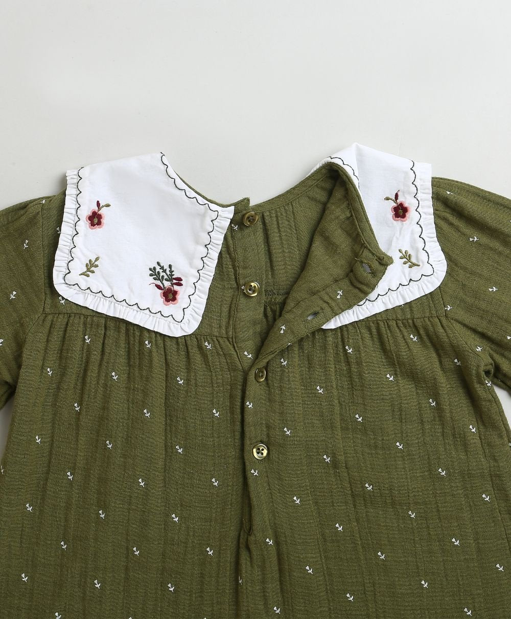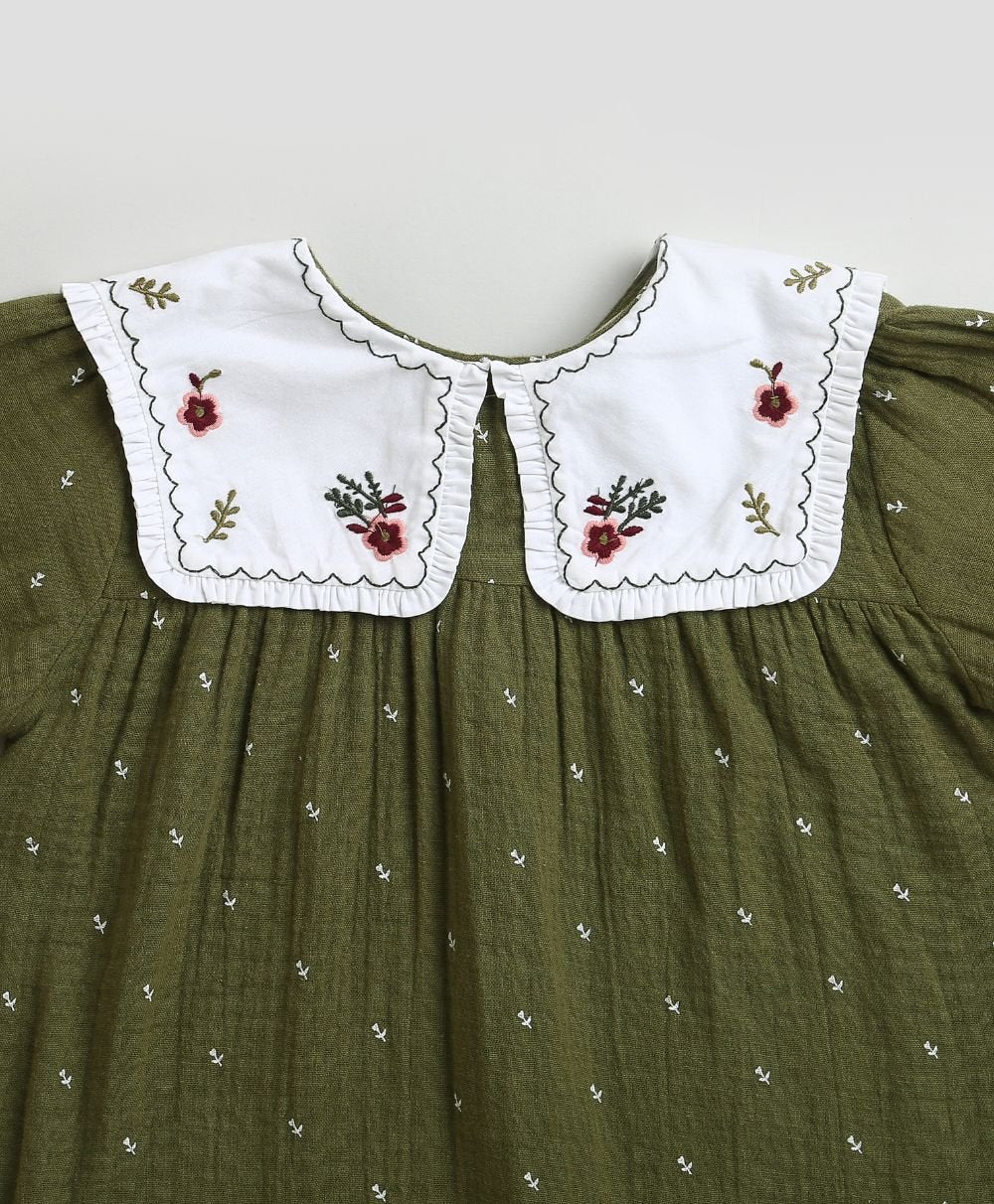 Sweetlime By AS introduces a Peter Pan Collar Olive Green Cotton Dress with a Matching Bloomer. The dress is crafted with soft double cloth fabric and has cute red floral embroidery on the peter pan collar. The dress has white floral print all-over and has long puffed sleeves