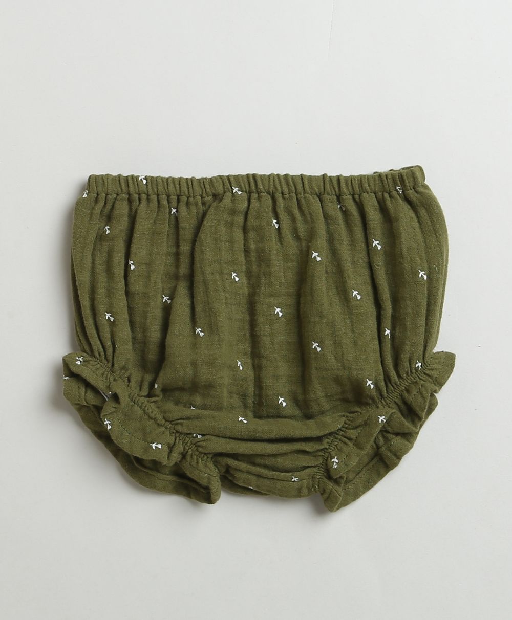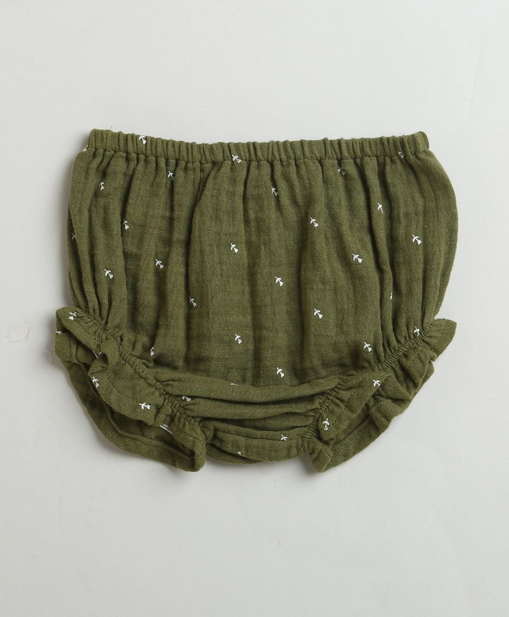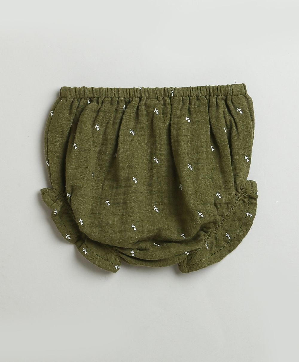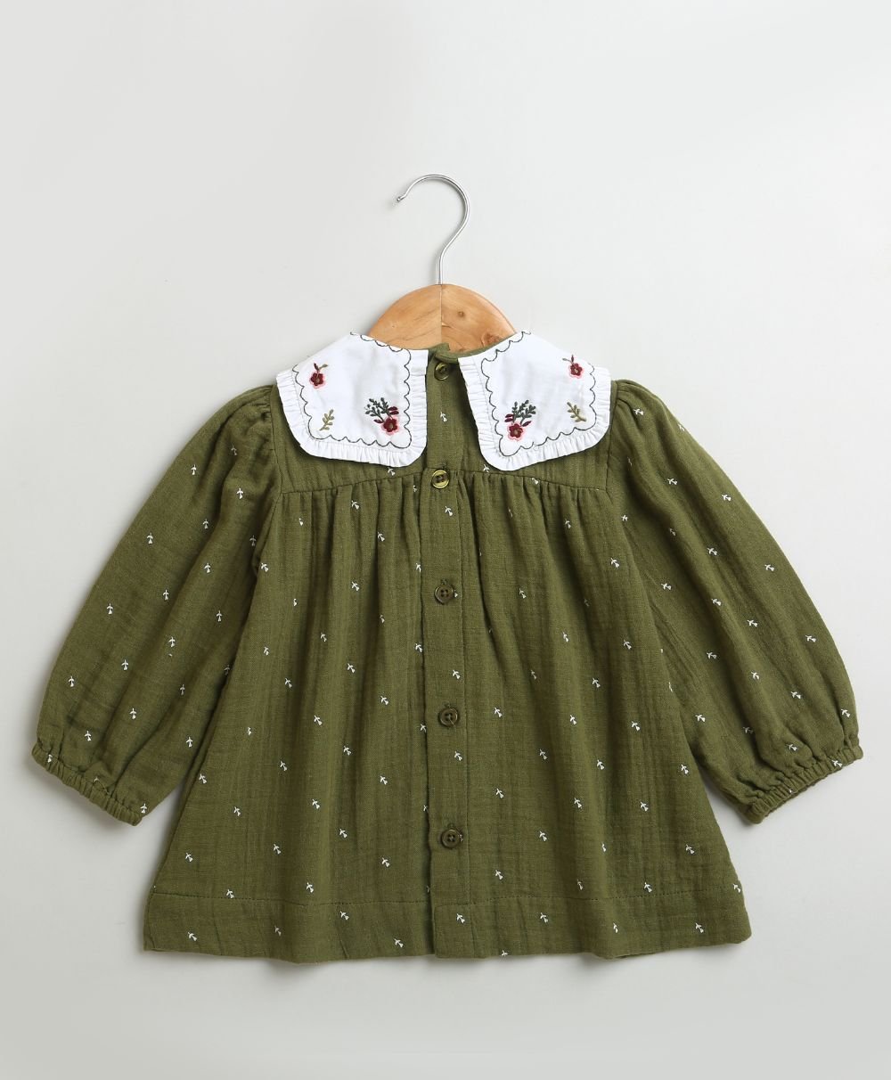 Sweetlime By AS introduces a Peter Pan Collar Olive Green Cotton Dress with a Matching Bloomer. The dress is crafted with soft double cloth fabric and has cute red floral embroidery on the peter pan collar. The dress has white floral print all-over and has long puffed sleeves