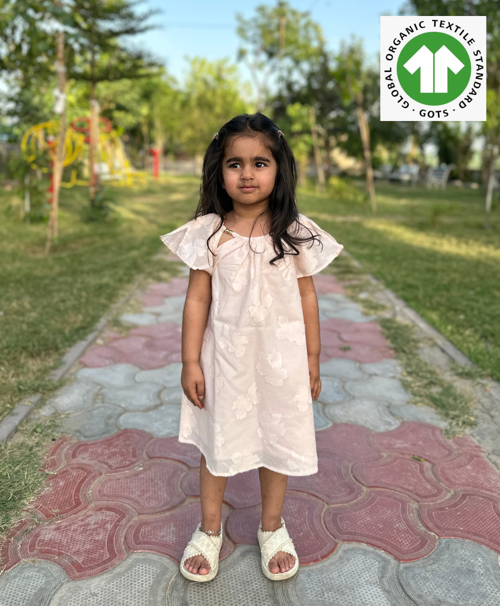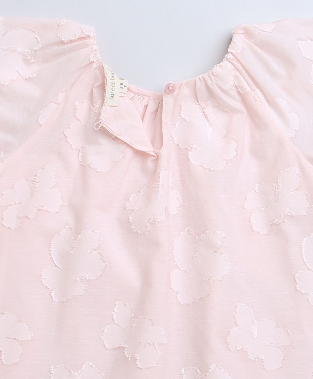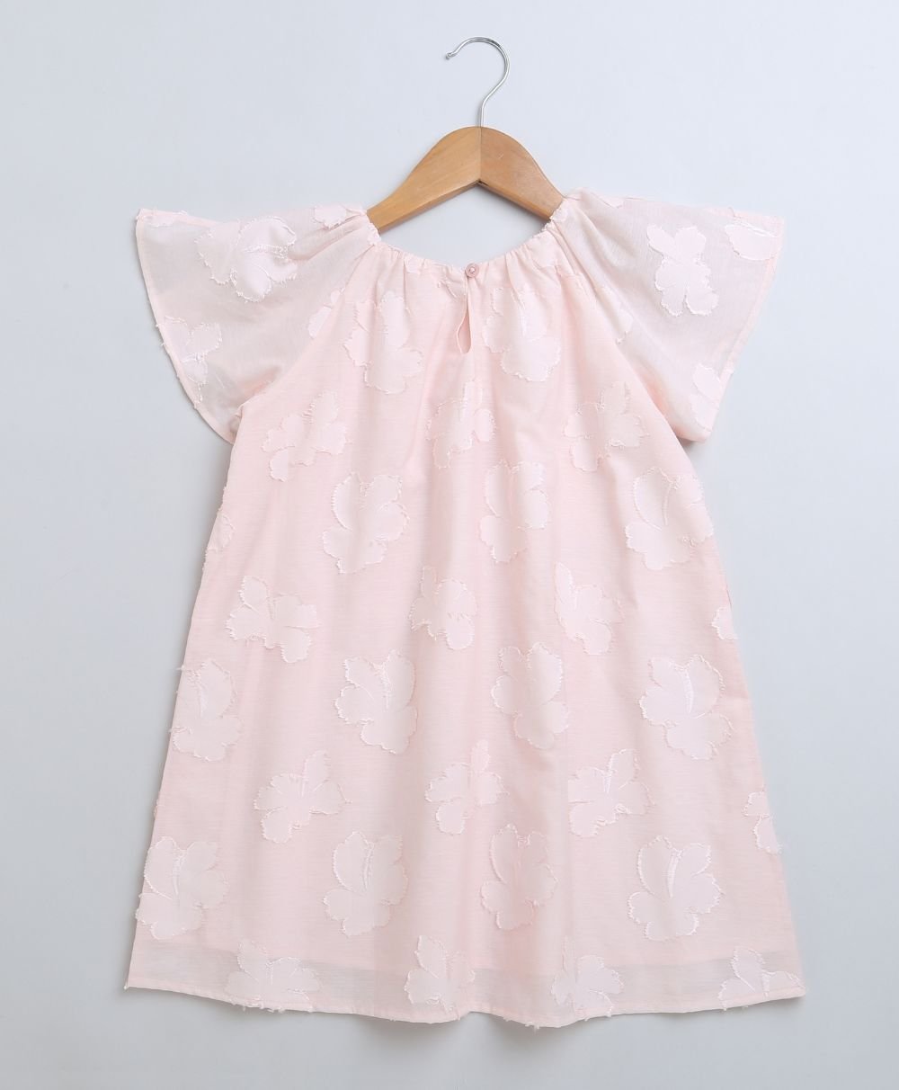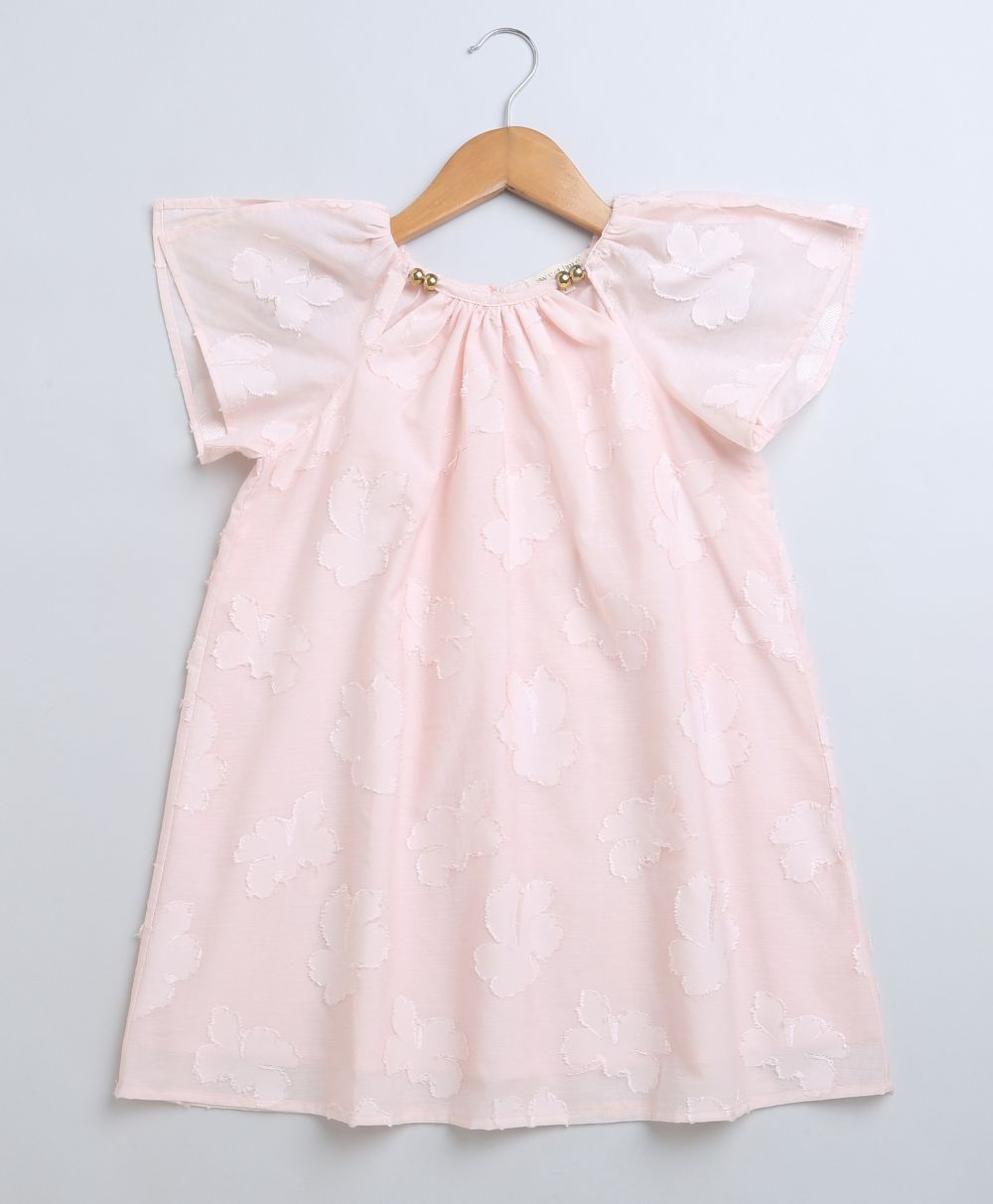 This Rose Pink Jacquard A-Line Cotton Dress by Sweetlime By AS is styled with golden beads on the neckline.