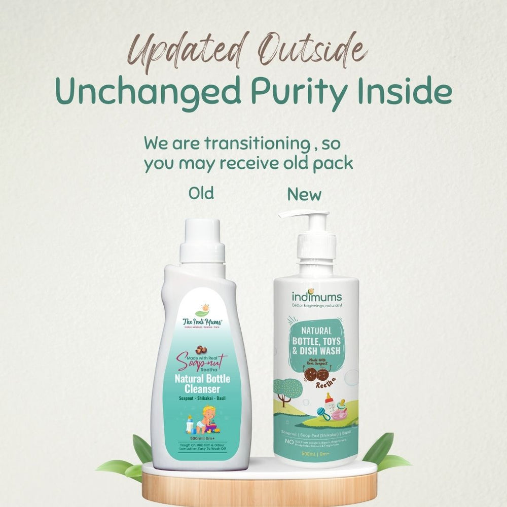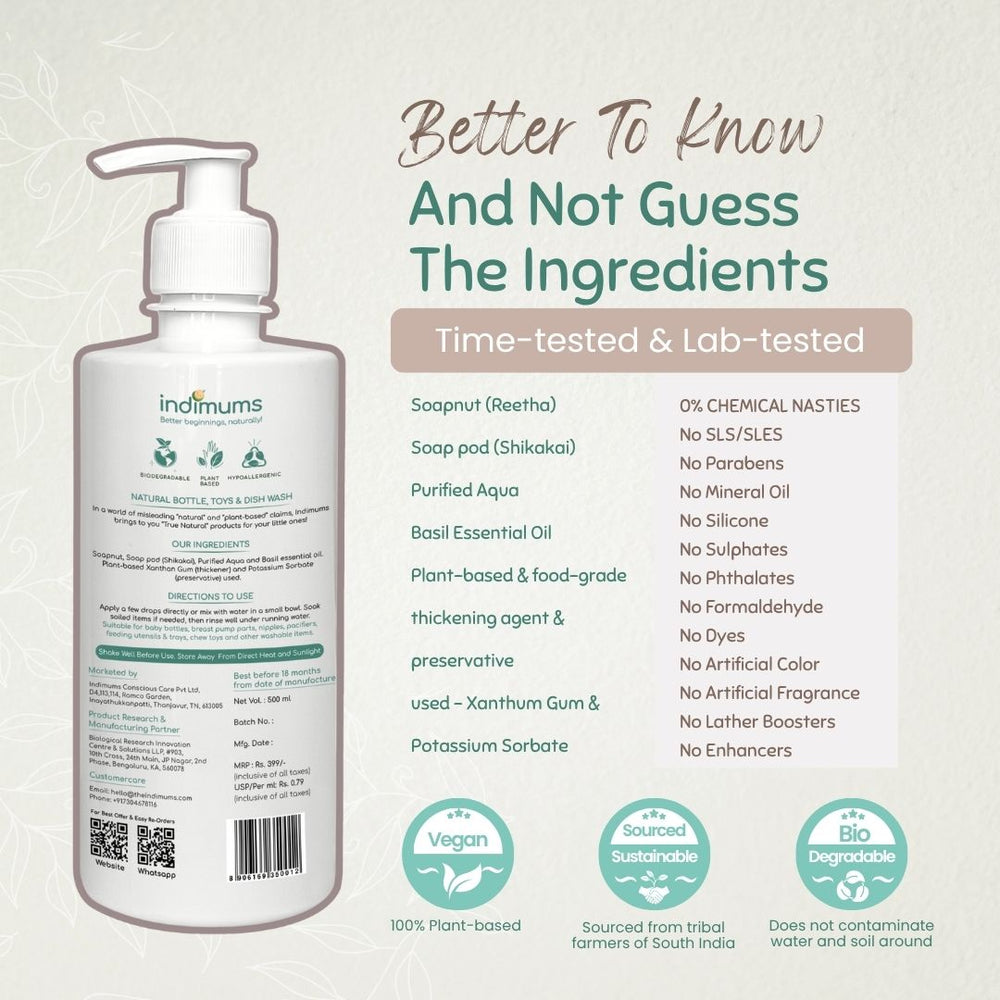 Introducing Indimums Soapnut (Reetha) Based Baby Bottle Cleaner and Toy Cleaner Liquid – a 100% Natural liquid soap crafted with organic ingredients and inspired by Ayurvedic wisdom. Naturally anti-bacterial and anti-fungal, this herbal blend is also free from toxins and chemicals, ensuring a germ-free and residue-free cleaning of your baby's feeding essentials and toys. Ideal for feeding utensils, milk and water bottles, nipples, pacifiers, chew and teething toys etc.