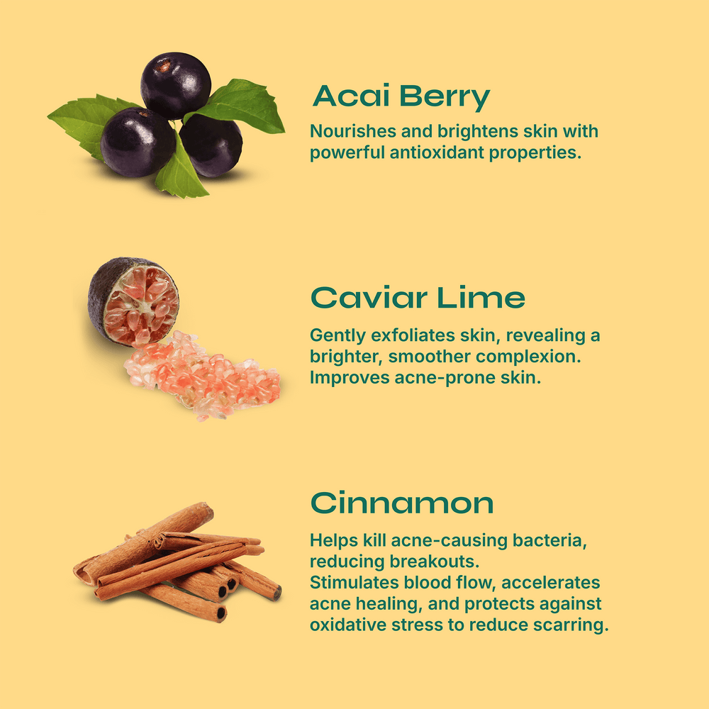 NATURALLY DERIVED & EFFECTIVE INGREDIENTS: Powered by Cinnamon, Acai Berry, and Caviar Lime to reduce redness, exfoliate, and brighten skin. Enriched with Coconut, Neem, and Olive for hydration, purification, and soothing effects.