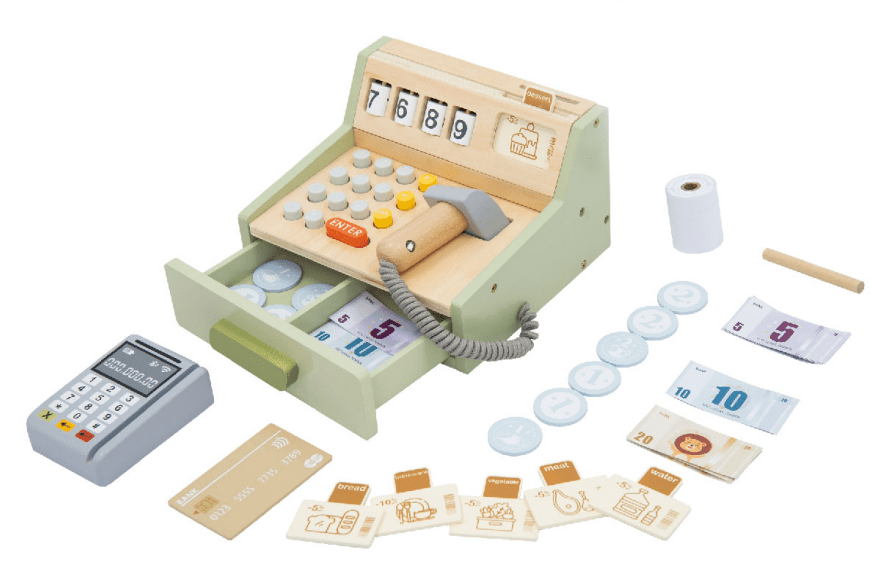 Designed with a classic wooden finish, this set includes a working cash drawer, calculator buttons, scanner, wooden coins, bills, cards, and a mini POS machine—everything kids need to enjoy realistic shop-and-pay pretend play.