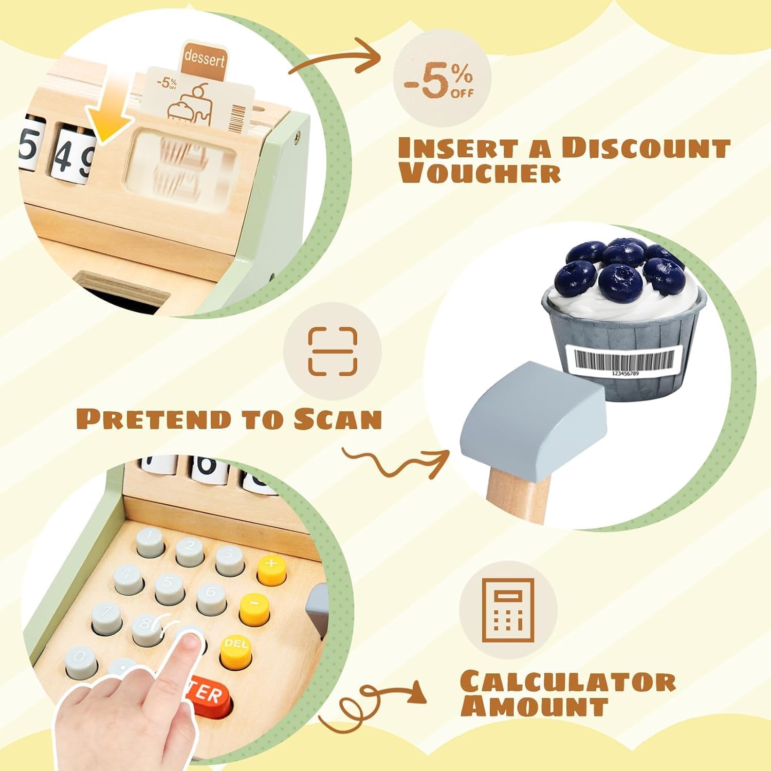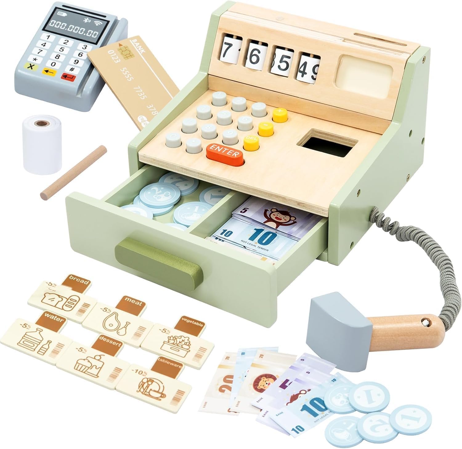Encourage imaginative role-play and early financial learning with the Wudly Wooden Cash Register Pretend Play Set.
